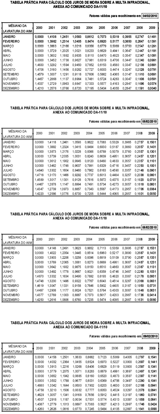Mora, anexas a este Comunicado, aplicáveis no período de 01/02/2010 a 12/02/2010, aos débitos de Multas Infracionais.